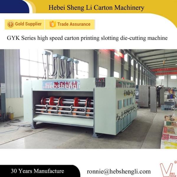 GYK 1370 series high speed corrugated cardboard printing machine is used for corrugated carton printing, adopt gear box lead edge feeder, metal roller, keep the quality highest, slotting, ratory die cutting. Adopt Chinese best brand electrical part and military bearing. keep the speed from 80-130pcs/min, big production per day.